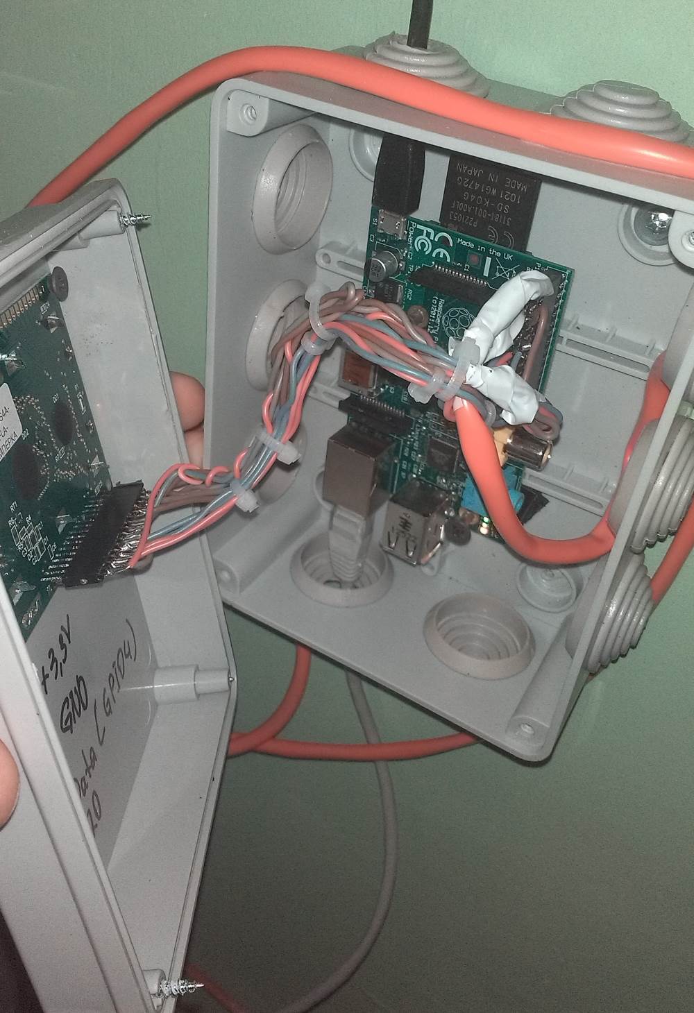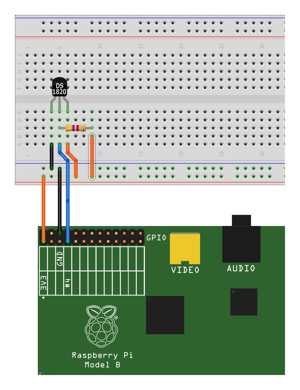 Датчики подключаются парралельно на один кабель. Протягиваем кабель от места установки Raspberry через те места, где мы хотим повесить датчики. После чего в конце линии вешаем датчик, подключив его к трем жилам кабеля(запоминаем цвета жил к каким подключили пины датчика) и соответственно по ходу линии делаем любое кол-во разрезов и врезаем туда датчики на те же цвета(не перепутать, а то можно спалить датчики). Также в любом месте между пином данных и пином +3,3в надо поставить один резистор 4.7кОм, я установил его в корпусе, но можно в любом месте на линии, где удобно. Наглядная сехма подключения датчика на макетной плате(для тестов) ниже: