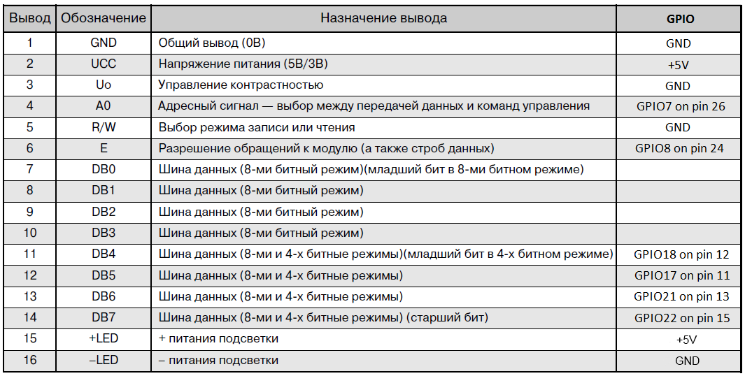 Если все работает, переходим к подлючению дисплея. Схема подключения пинов дисплея к пинам GPIO показаны ниже(4х битный режим):