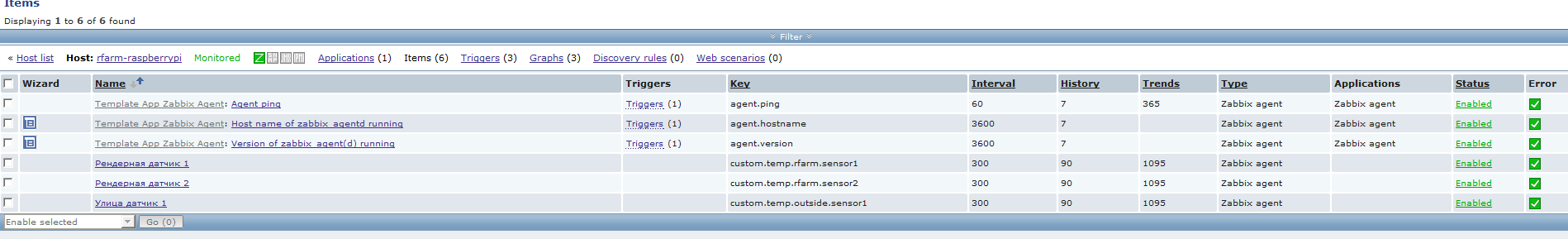 # /usr/local/zabbix_agent/sbin/zabbix_agentd -t custom.temp.rfarm.sensor1 custom.temp.rfarm.sensor1 [t|17.812] # /usr/local/zabbix_agent/sbin/zabbix_agentd -t custom.temp.rfarm.sensor2 custom.temp.rfarm.sensor2 [t|11.812] # /usr/local/zabbix_agent/sbin/zabbix_agentd -t custom.temp.outside.sensor1 custom.temp.outside.sensor1 [t|-5.125]