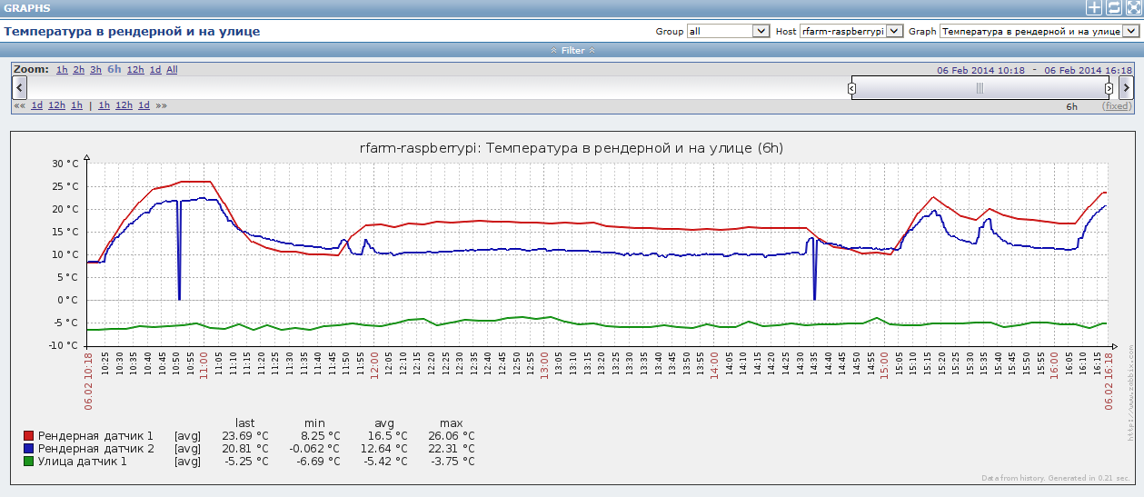 В итоге получили прибор, который в режиме реального времени выводит информацию по температуре с датчиков на дисплей, а также коллекционируется статистика по температуре и строятся графики с помощью zabbix. Ниже можно поглядеть как это выглядит в жизне.