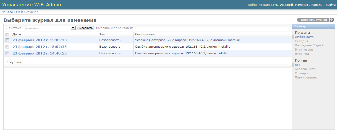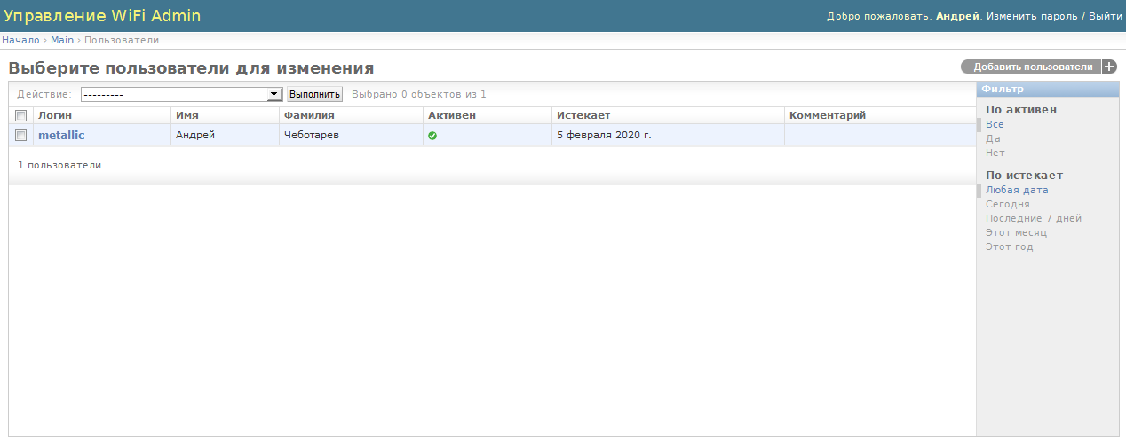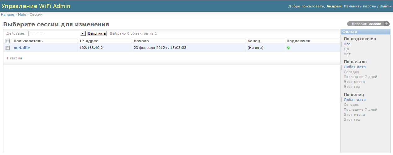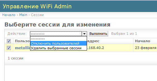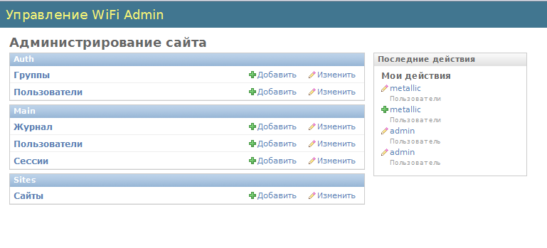 В админке в wifiadmin есть несколько разделов: Auth и Main. В первом разделе создаются пользователи и группы, это стандартный раздел django admin, по большому счету там можно создавать только пользователей и давать им права суперпользователя, эти акаунты нужны только для входа в админку. Второй раздел main относится к wifi, там как раз создаются пользователи для доступа в интернет. У пользователей есть несколько параметров, такие как срок действия акаунта, активен он или нет и т.д. В журнал в обычном режиме пишутся события безопасности, а в режиме отладки подробный отчет о всех выполненных действиях на каждом этапе. Ну и наконец раздел «сессии» содержит информацию о подключениях, дата подключения, активна ли сессия и с какого адреса было открыто подключение. Тут же есть функция ручного отключения пользователя, если сессия активна.